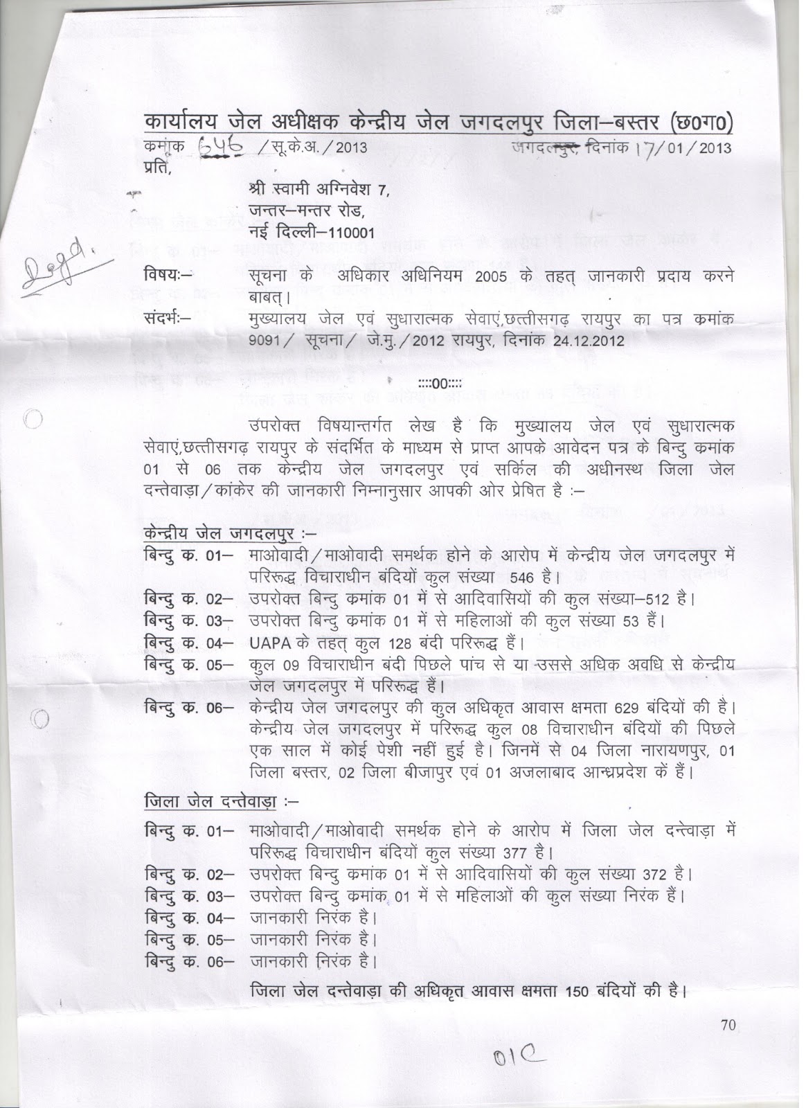 स्वामी अग्निवेश द्वारा सूचना के अधिकार के अंतर्गत छत्तीसगढ़ की जेलों के विषय में माँगी गई सूचना के जवाब में सरकार ने निम्नांकित सूचना दी है .