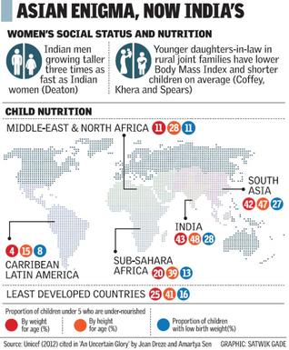A growing body of evidence is also now showing that the low social status of women — something difficult to capture statistically — could be a big part of the explanation. A new working paper by economists Diane Coffey, a PhD candidate at the Office of Population Research at Princeton University; Reetika Khera of the Indian Institute of Technology-Delhi; and Mr. Spears has shown that the younger daughters-in-law in a rural joint family have shorter children on average.