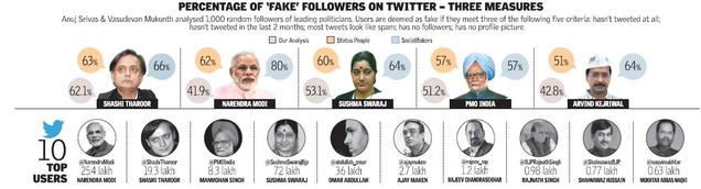 Many of Mr. Modi’s online followers meet all these criteria. But he is not the only one with a legion of Twitter followers with questionable credentials. Online analysis of almost all Twitter celebrities reveals a similar picture. Even accounts of professionals in various fields with a few thousand followers have a significant percentage of ‘fakes’ making up the list.