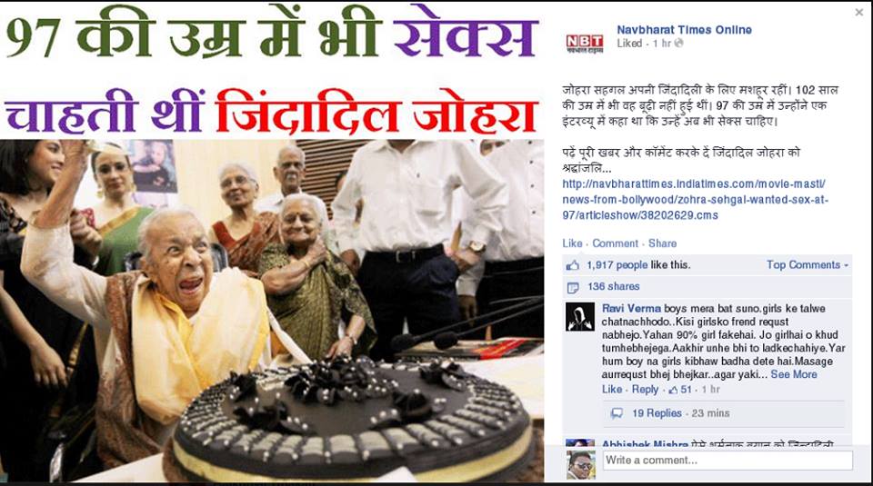 मुझे लगता है कि हमारे समाज में सेक्स को लेकर जिस तरह के दुराग्रह हैं, उन्हें तोड़ने का मौका अगर एक भी जगह मिलता है तो हमें नहीं चूकना चाहिए। जोहरा की जिंदादिली की हजारों मिसाल दी जाती हैं। वह बुरका नहीं पहनती थीं, वह खूब हंसती थीं, 100 साल की उम्र में भी काम करती थीं, आदि आदि। लेकिन कितने लोग होंगे जो यह कहने की हिम्मत रखेंगे को सेक्स और हास्य दोनों जिंदगी के पलड़ों में तोला जाए तो बराबर भार होगा? जोहरा ने यह कहने की हिम्मत की थी। उन्होंने सार्वजनिक तौर पर, एक इंटरव्यू में यह बात कही। सेक्स की इच्छा रखना, और वह भी 97 साल की उम्र में, ऊपर से एक मुसलमान और फिर औरत। आमतौर पर हमारे पुरुषवादी पाठकों के लिए यह ‘भद्दी’ बात होगी। लेकिन क्या वाकई ऐसा है? क्या एक बूढ़ी, मुसलमान महिला का सेक्स की इच्छा रखना भद्दी बात है? या उसे सार्वजनिक तौर पर कहना भद्दी बात है? मुझे लगता है कि यह बात उठाई जानी चाहिए थी। सिर्फ उनकी शख्सियत का अलग पहलू दिखाने के लिए नहीं, बल्कि यह बताने के लिए भी कि सेक्स के मायने उतने दकियानूसी नहीं होते जितने इस पुरुषवादी समाज में आमतौर पर समझे जाते हैं। उनकी शख्सियत के बाकी पहलू तो आते ही रहते हैं, लेकिन मुझे लगा कि यह भी एक बहुत दिलचस्प, अलग और जरूरी पहलू है, जिसके मायने गहरे हो सकते हैं। हो सकता है इस खबर को पढ़कर कोई लड़की उन वर्जनाओं से आजाद हो पाए, जिन्हें जबर्दस्ती उसके गले में टांग दिया गया था। हो सकता है, इस खबर को पढ़कर कोई लड़का सोचे कि औरत स्वच्छंद होना बुरा नहीं। हो सकता है कि मुसलमानों को पिछड़ा और तंगदिमाग समझने वाला कोई व्यक्ति जान पाए कि मुसलमान औरतें भी आधुनिक हो सकती हैं।