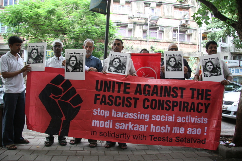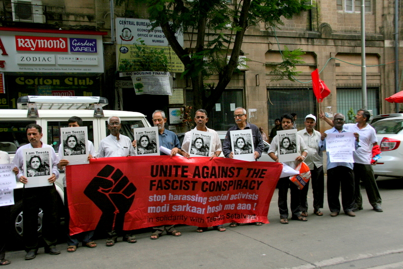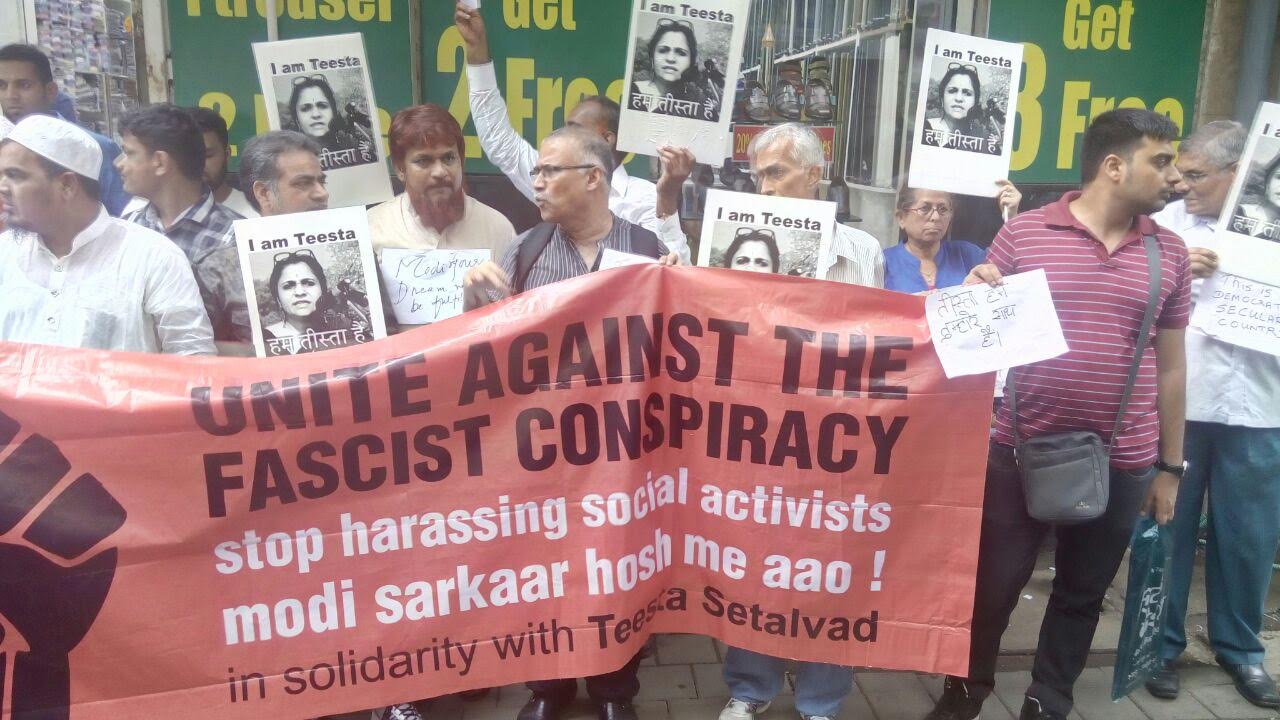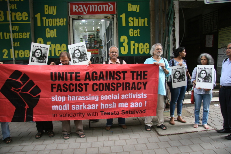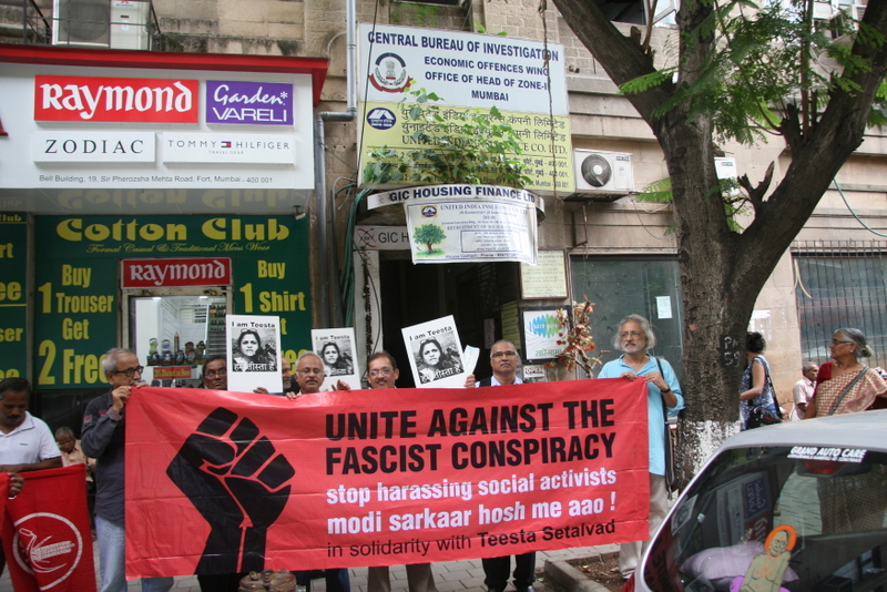 सोमवार को मुंबई के फोर्ट में स्थित सीबीआई की आर्थिक अपराध शाखा के दफ्तर के बाहर तमाम नागरिकों, संगठनों और सामाजिक कार्यकर्ताओं ने मानवाधिकार कार्यकर्त्री तीस्ता सेतलवाड़ के समर्थन में एकजुटता दिखाई।