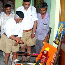 RSS के समारोह में शस्त्र पूजन यानी बंदूक-पिस्तौल की पूजा करते स्वयंसेवक बंदारू दत्तात्रेय.