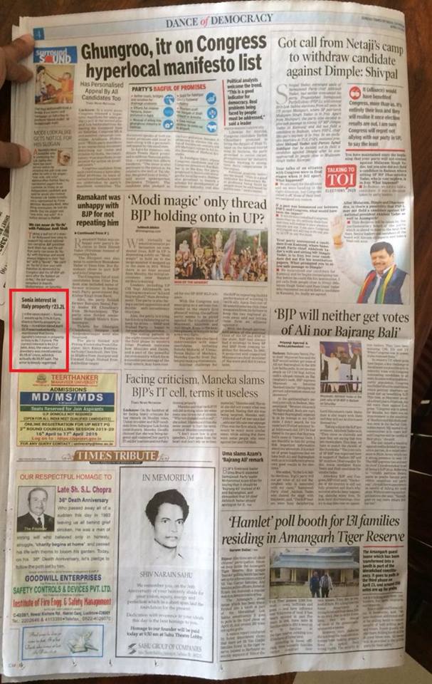 टाइम्स ऑफ इंडिया, लखनऊ संस्करण में एक विशेष पन्ना, चौथे पेज पर ‘Dance of Democracy’ और उस पर बिग बॉटम में (तस्वीर में देखें) ये ख़बर, जो बता रही है कि ‘पिछले 5 सालों में सोनिया गांधी की सम्पत्ति 21 फीसदी बढ़ी, जिसमें इटली में उनकी पारिवारिक सम्पत्ति में हिस्सा भी शामिल है।’ इस ख़बर में लिखा गया था कि सोनिया की इटली में पारिवारिक संपत्ति से हासिल ब्याज़ 7.5 करोड़ है, जबकि ये 23.2 लाख है। और तो और उनके पास मौजूद ज़ेवरात की कीमत 59.97 करोड़ रुपए बताई गई थी, जो कि दरअसल 59.97 लाख रुपए है।