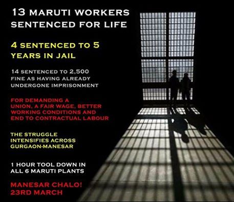 23 March ko Chalo Manesar! March 19, 2017 “13 of our brothers have been given ‘life sentences’ – including 12 Maruti Suzuki Workers Union body members – on the baseless charge of ‘murder’ on 18 March afternoon by the Gurgaon Additional Sessions Court. 4 workers given 5 year sentences. 14 workers given 3 years, but have already spent 4 years in prison, so released. Of … Continue reading 13 Maruti Union members given ‘Life Sentence’ for Struggling for Union Formation & Abolition of the Contract Worker System